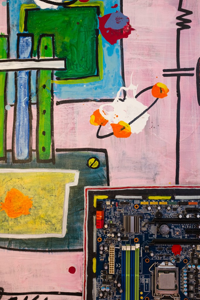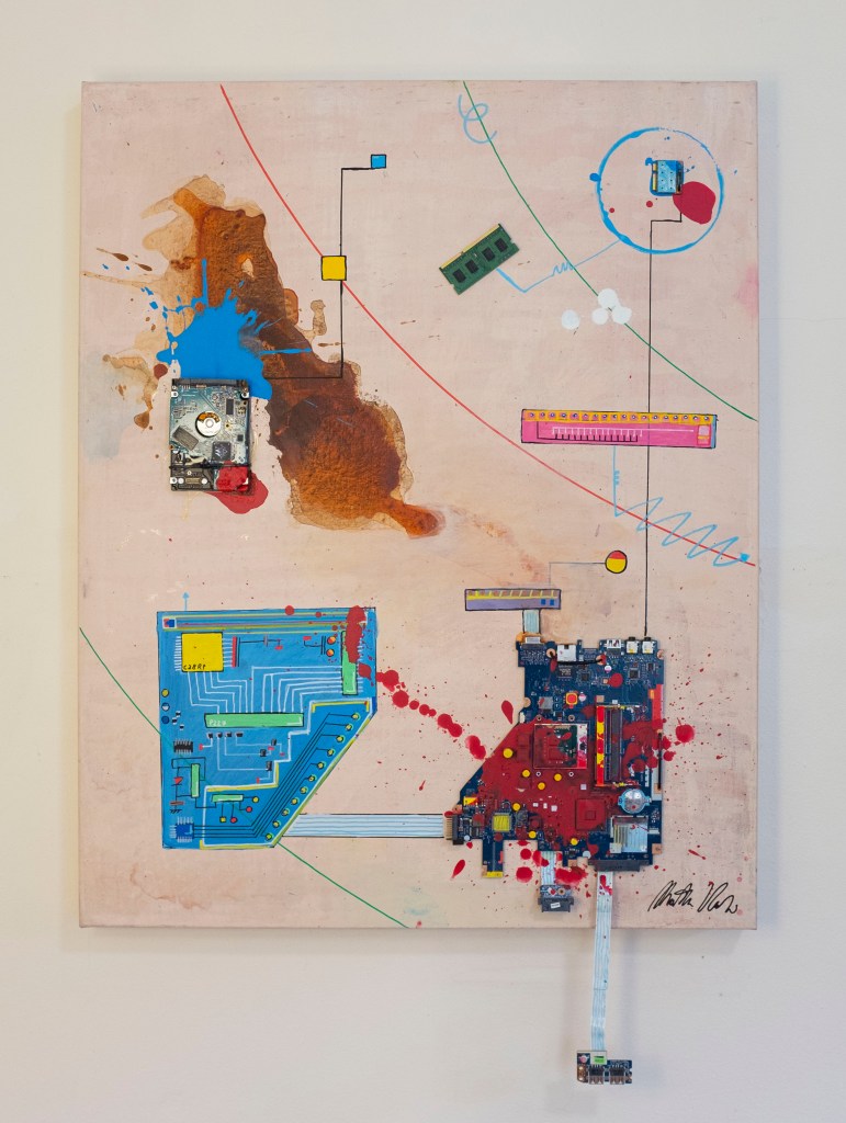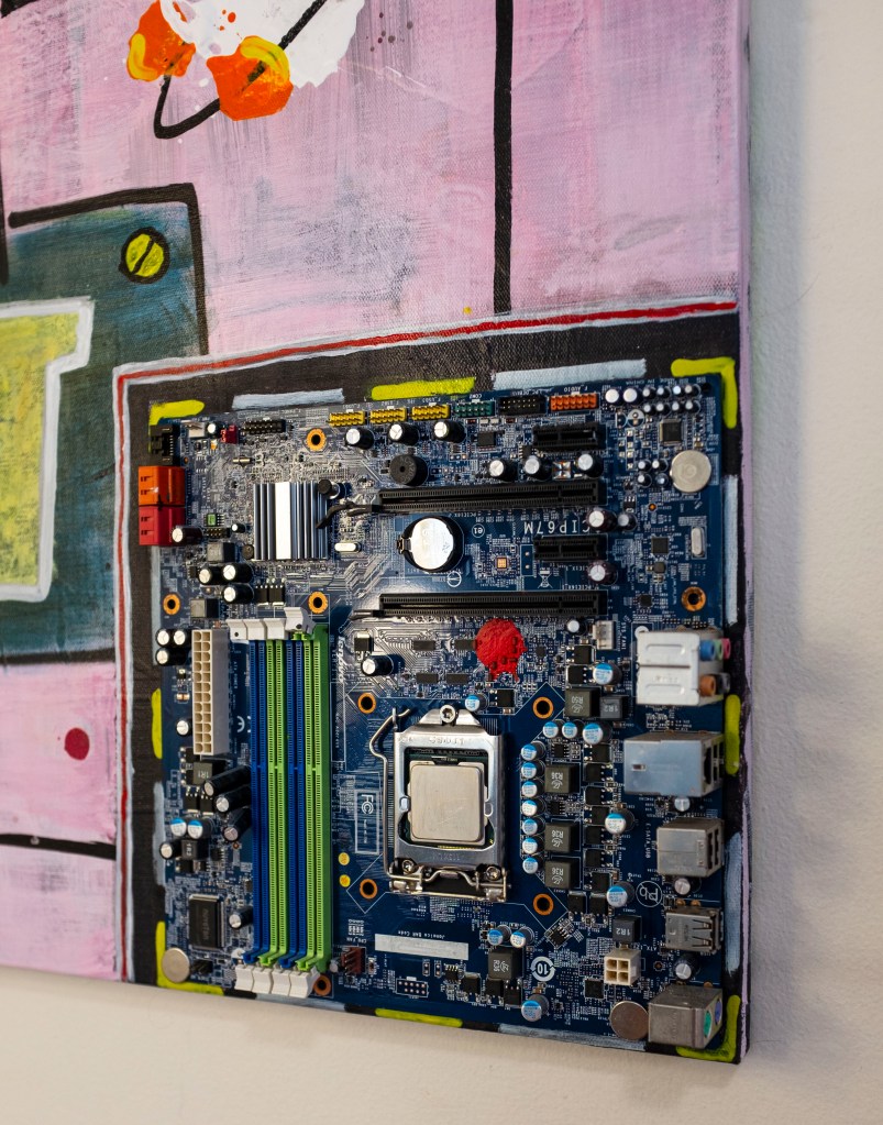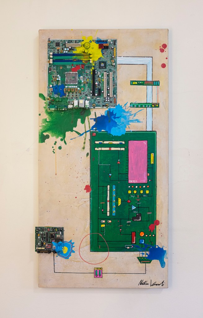 Acrylic on Canvas and applied motherboard. 50x75cm.